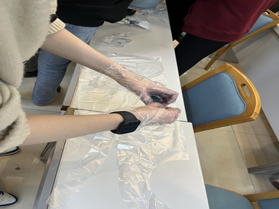 随后是扎染制作阶段,同学们零距离接触扎染,掌握扎染的基本手法,在自然中寻找“形”与“色”。一块布,一扎皮筋,一盆染料,通过缠绕、折叠、扭曲等不同手法,创造出独一无二的艺术品。