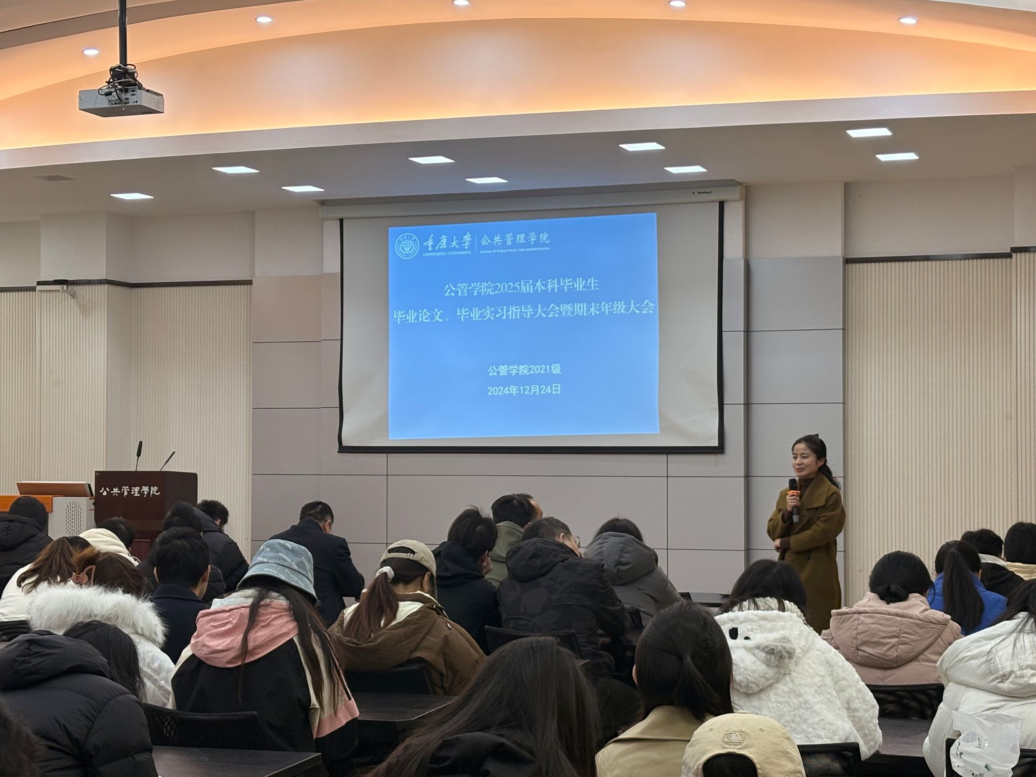 为全面指导2025届本科毕业生顺利推进毕业论文工作、高效完成毕业实习任务,总结一个学期的学习和就业情况,2024年12月24日下午14:00,学院在102报告厅召开了2021级本科生毕业论文、毕业实习指导大会暨期末年级大会。公司党委副书记、纪委书记周余斌,副经理丁从明,行政管理系的张金凤、土地资源与城市发展管理系的田俊峰和公共人力与社会保障系的钟兴菊等领导和老师出席了会议。会议由学院团委书记兼2025届本科毕业生辅导员徐柳主持,2025届全体本科毕业生到场参会。