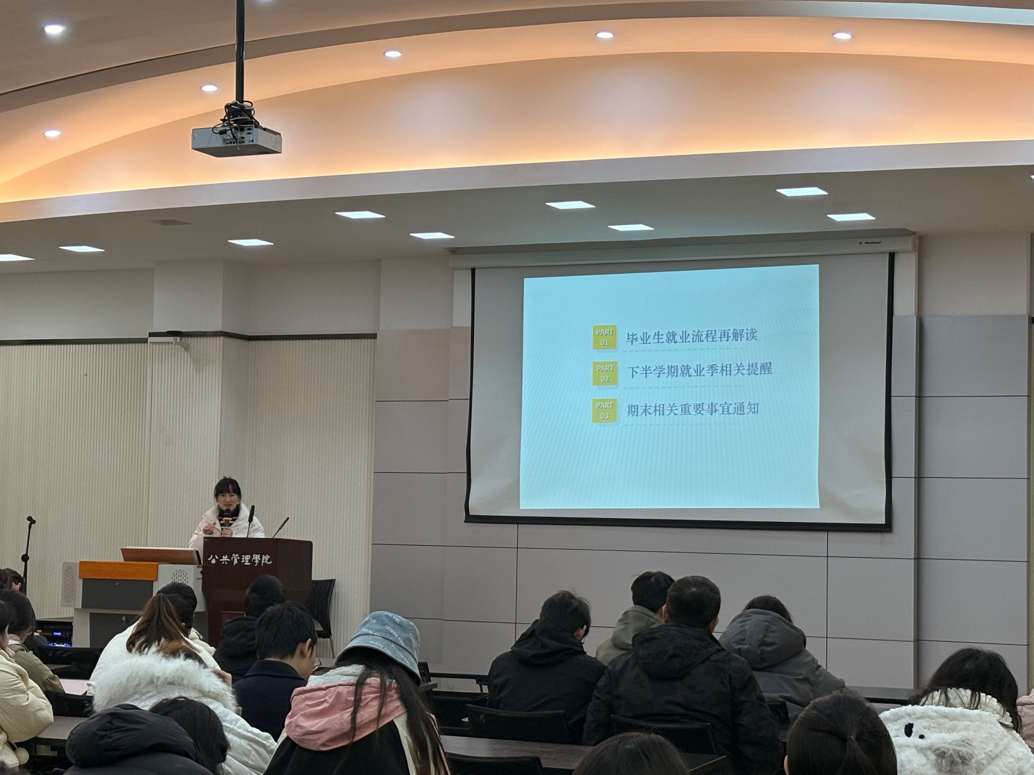 最后,徐柳老师主要围绕毕业生就业流程再解读、下学期就业季相关提醒、期末相关重要事宜三方面内容进行了具体讲解。她再次详细介绍了毕业生就业流程和解约流程,强调了签订和解除三方协议的注意事项,叮嘱同学们制定合理目标、把握就业机会,为同学们提供了详尽的就业指导。此外,徐柳老师进一步强调了期末考试的纪律要求与毕业学分审查,提醒同学们要认真备考、诚信应考,高度关注毕业学分修读情况。