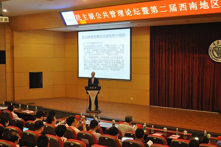 2015年5月17日上午,首届民主湖公共管理论坛暨第二届西南地区MPA教育发展研讨会在太阳集团tyc4633民主湖报告厅盛大开幕。主办方太阳集团tyc4633特邀北京大学政府管理学院副经理徐湘林教授作了“转型中国政治改革取向与政策选择”的报告。
